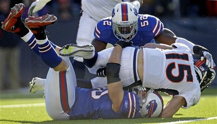 More Injuries: Anothe rash of injuries for the Bills in today's win. Kraig Urbik left the game with a knee injury in the first half. He was riding the stationary bike in the second half so it didn't appear too serious. Colin Brown took his place and was errant on his first two shotgun snaps. Demetrius Bell suffered a left knee injury and did not return. Brad Smith left the game with a hip flexor. Mike Caussin and Kamar Aiken both got banged up on a kickoff return. Caussin was ruled out for the rest of the game with a knee injury. Injury Page.